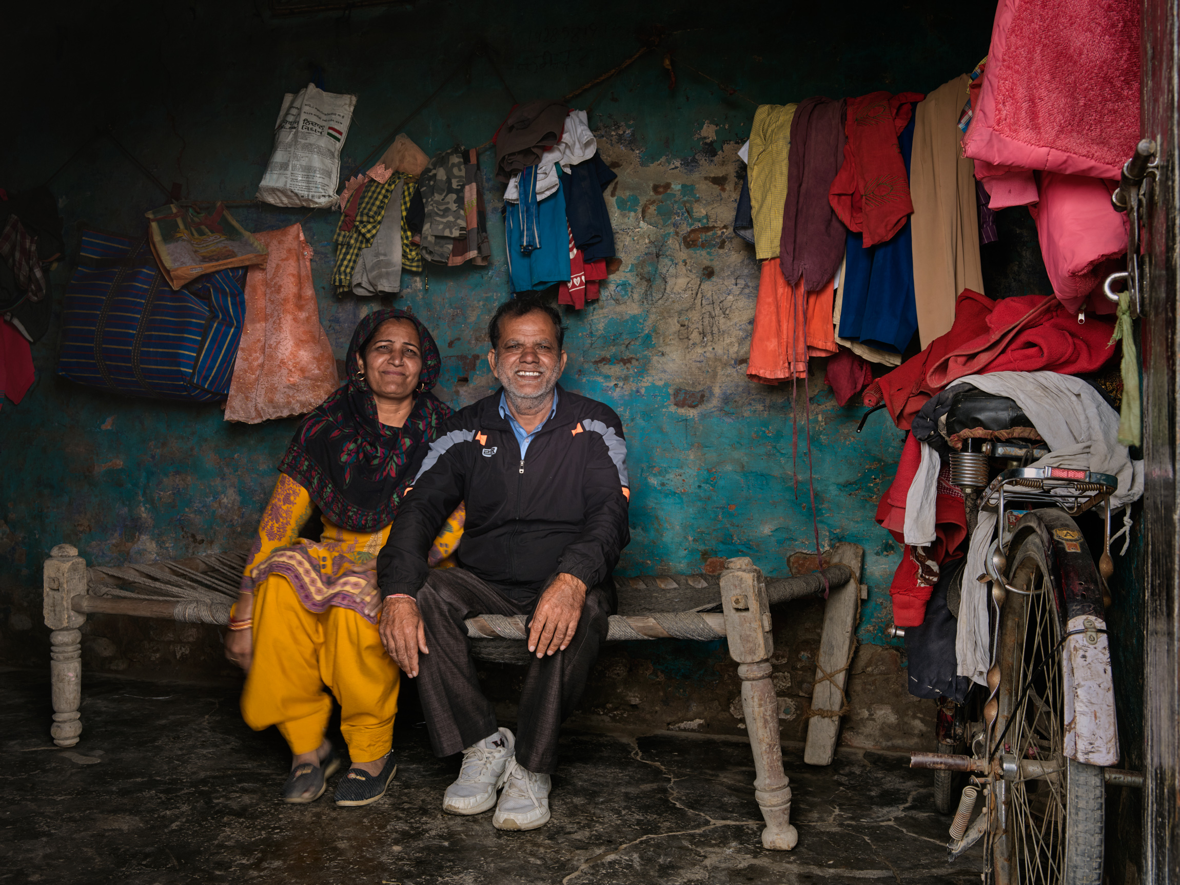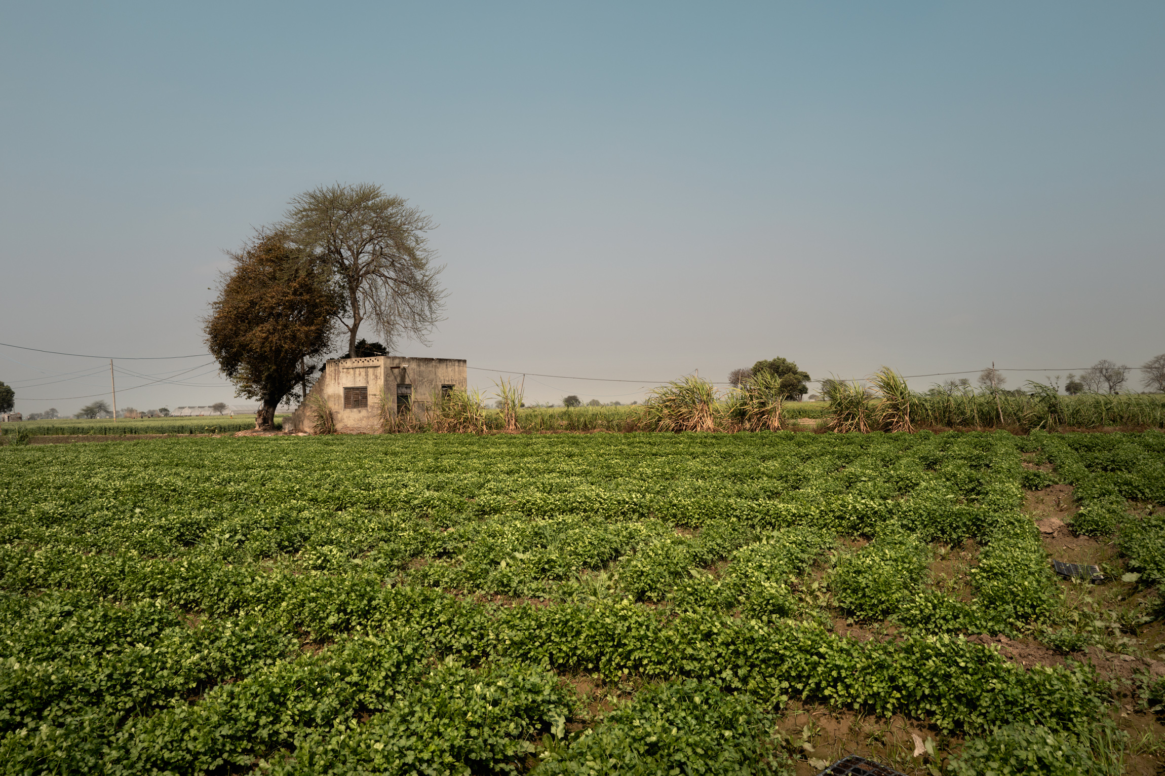 Satish and Darshan Kumar grow potatoes and different kinds of vegetables on five acres. In 2019 they were the first in this area to take their lead from Urban Farms Co. in switching to regenerative methods. We meet Satish and Darshan on their land, where the entire family and workers are harvesting the potatoes, digging them up, sorting and packaging them by hand. It is the hottest part of the day, the sun is directly overhead and the hut is the only place that offers relief from the burning sun. It’s crawling with children of all ages and the mood is cheerful, even joyful. Darshan smiles broadly as she tells us what she thinks of the transition. ‘Look around you and see how the land looks. Look at our potatoes, you should taste them.’ She holds out a bucket to us: ‘Here, taste them, taste them.’