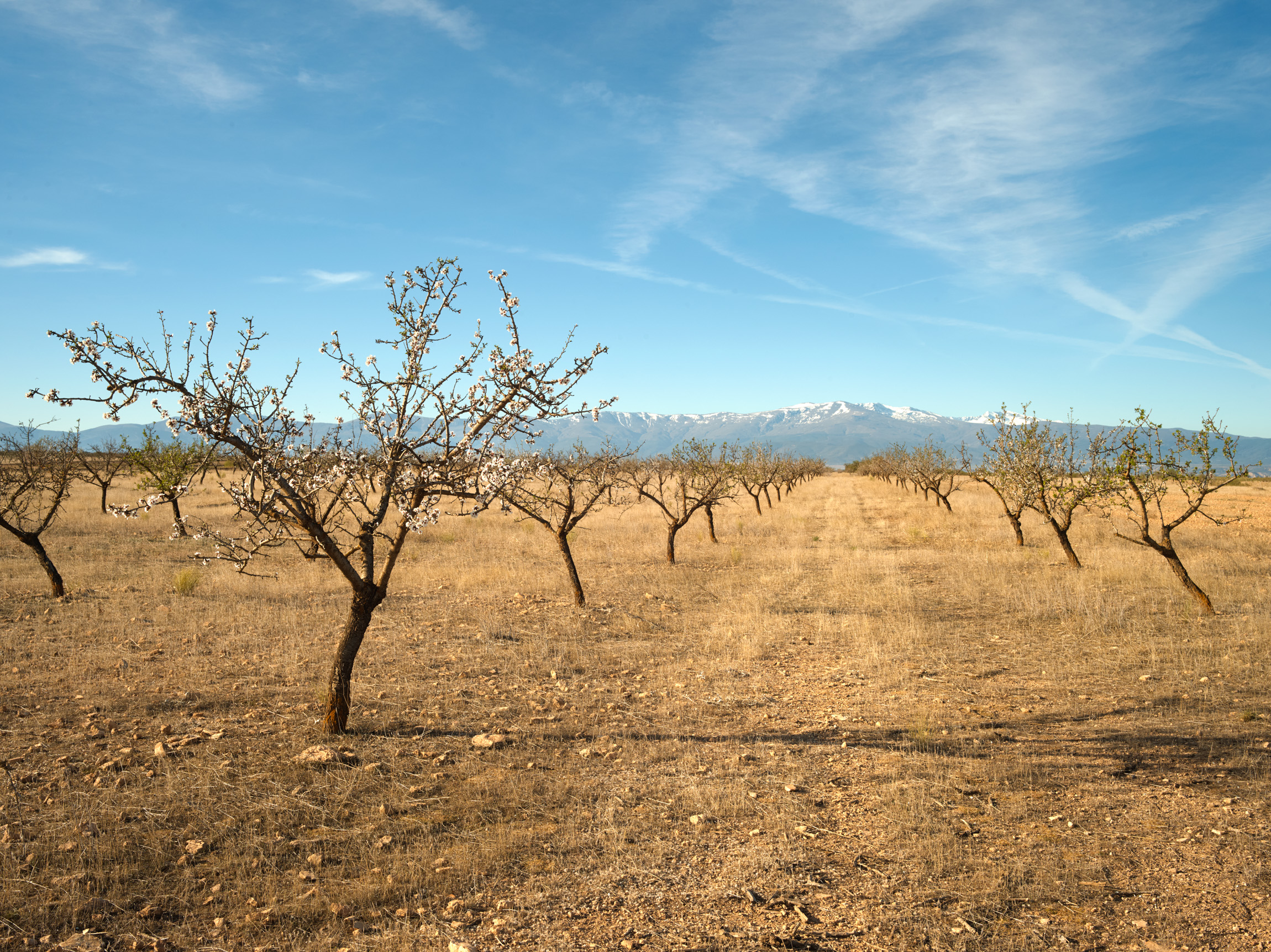 We stop along the way to photograph one of the thousands of almond orchards in this region. They have brought the area both prosperity and calamity. It’s a surreal image, a lunar landscape of white rock, a desert with thousands of small trees lined up, standing there sucking the last drop of water out of the ground, where nothing else grows, not a single blade of grass. All leaves and flowers are seen as competition for that remaining scrap of water. This attitude results in depleted soils that are eroded by exposure to sun and wind, and overexploitation of aquifers and in loss of biodiversity. That is the toll of the almond industry.