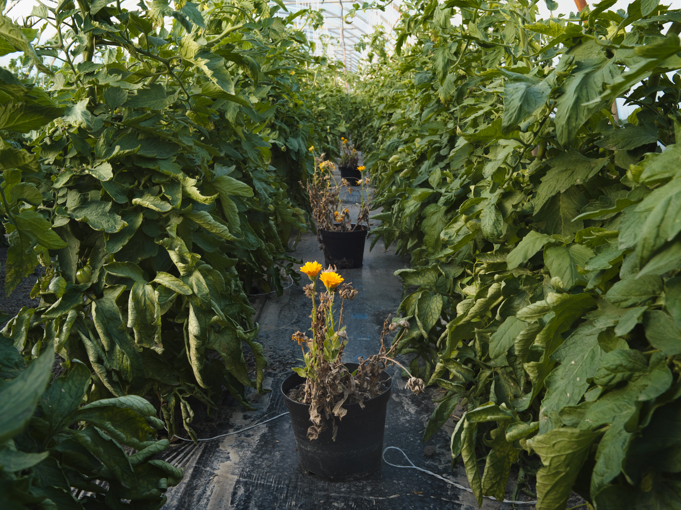 As well as growing vegetables in the open field, Serge and Guillaume have a number of plastic tunnels for the cultivation of tomatoes, cucumbers and other crops. We are given a tour of the tunnels and it strikes us that in the paths between the tomatoes are plants that seem more dead than alive. When we ask about them, we are told they are an effective means of combatting infestations in tomato plants. They are marigolds or calendula, a plant we know only as a treatment for our children’s grazed knees. Serge explains that he grows marigolds to catch insects. Both “the good guys and the bad guys” are hugely attracted to marigolds, and when they are full of insects, he puts large numbers of them next to his tomatoes. When the good guys have had their fill of the bad guys, he stops watering them. The marigolds die and the beneficial insects have no choice but to jump onto the tomato plants, where they continue eating voraciously, feasting on pests. It is a method as simple as it is effective. These and other inventive solutions are thought up by father and son together, then tested and perfected and shared with other growers.