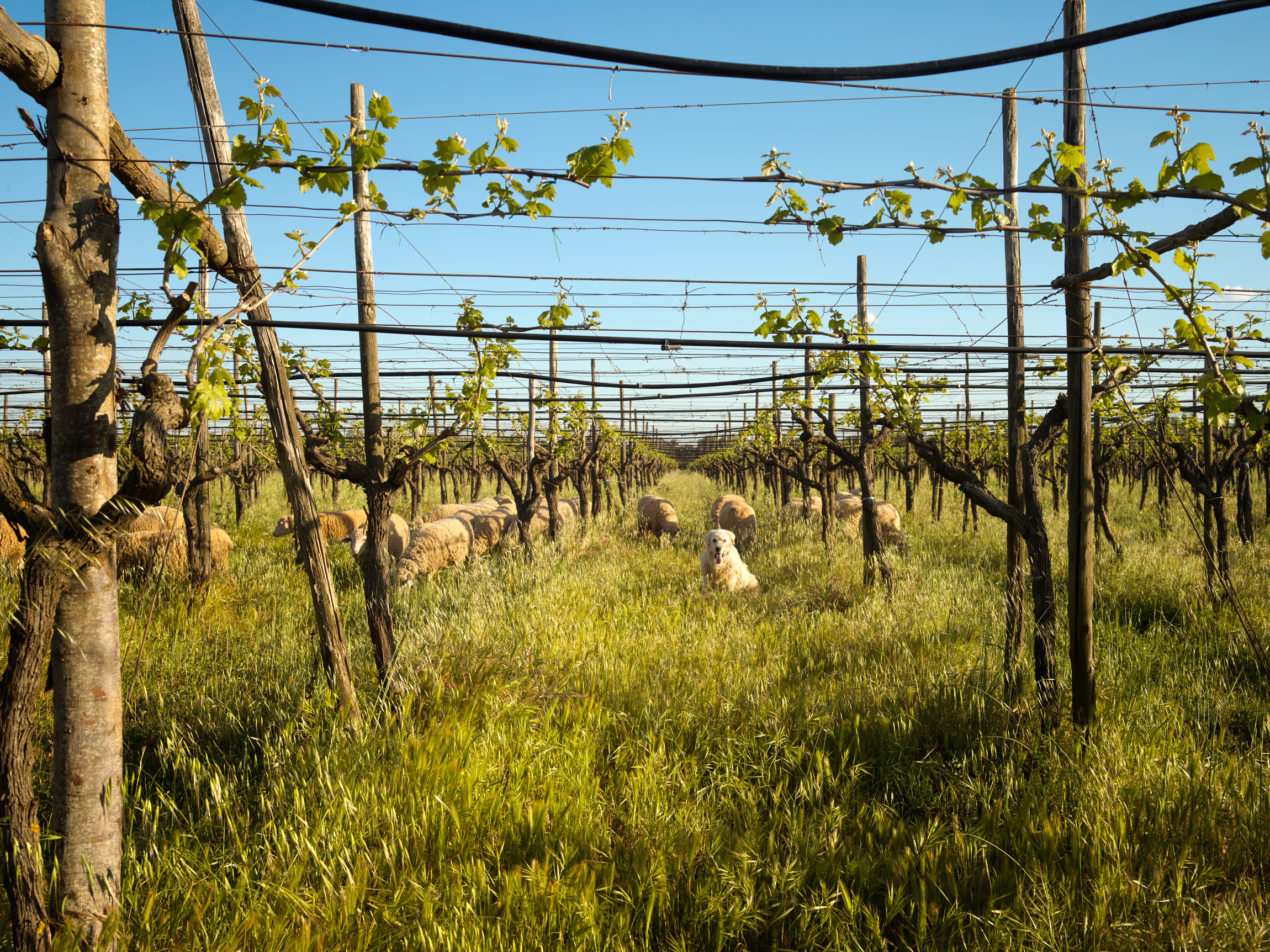 The vineyard, where grass and flowers grow and ensure biodiversity, is not mown but grazed by a herd of sheep, again according to the principles of regenerative agriculture. Here it’s a matter of ‘the land feeds the sheep and the sheep feed the land’. These are not Xfarm’s sheep, incidentally, but the neighbour’s. The principle is more or less the same. Xfarm feeds the neighbour’s sheep and the neighbour’s sheep cut the grass.