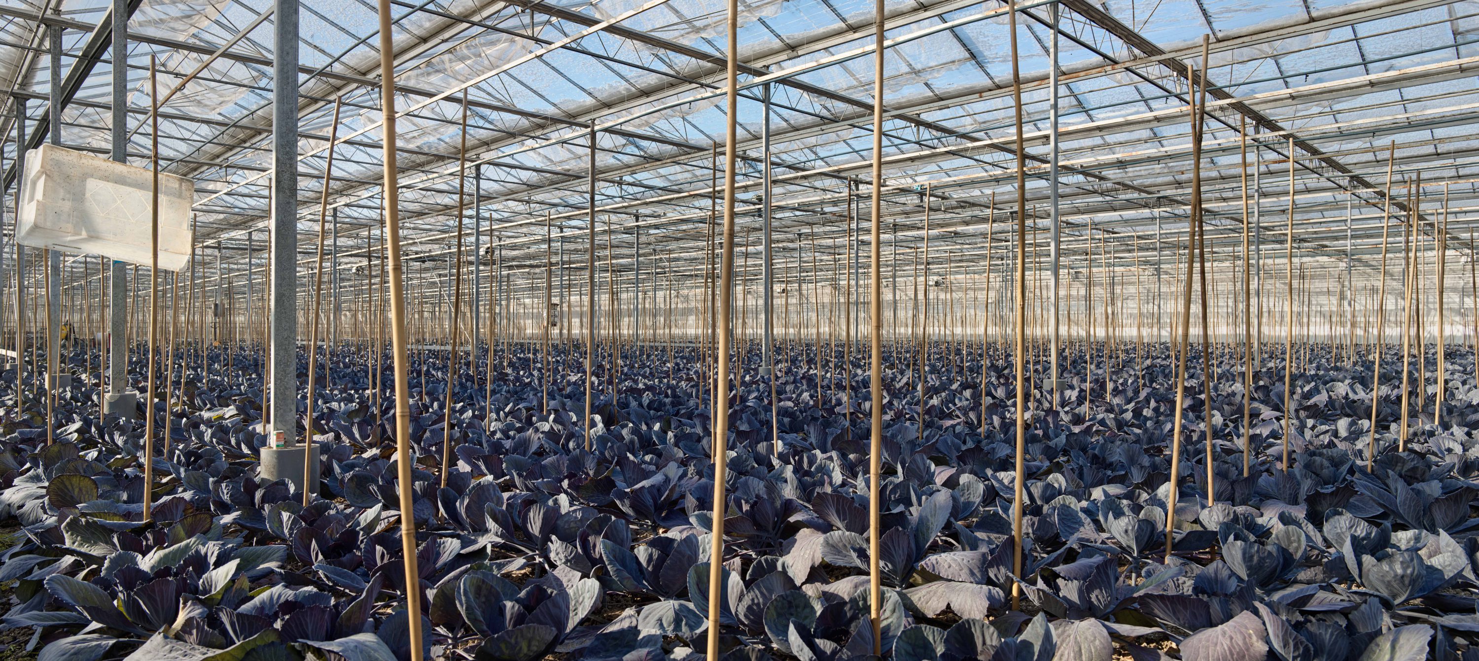 In this part of the greenhouse Ron grows red cabbage, his favorite crop, for seed production. A beautiful crop set out in neat rows. A female row, a male row, a female row and so on.