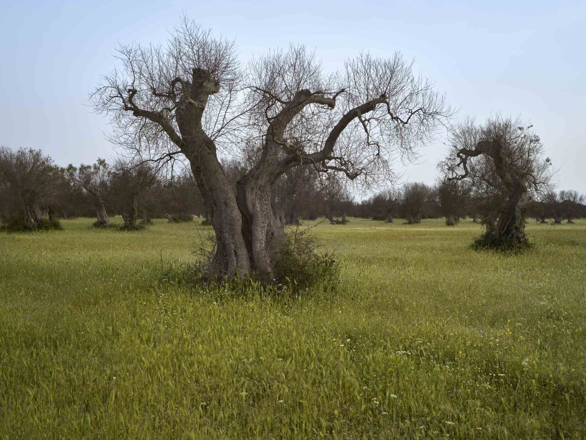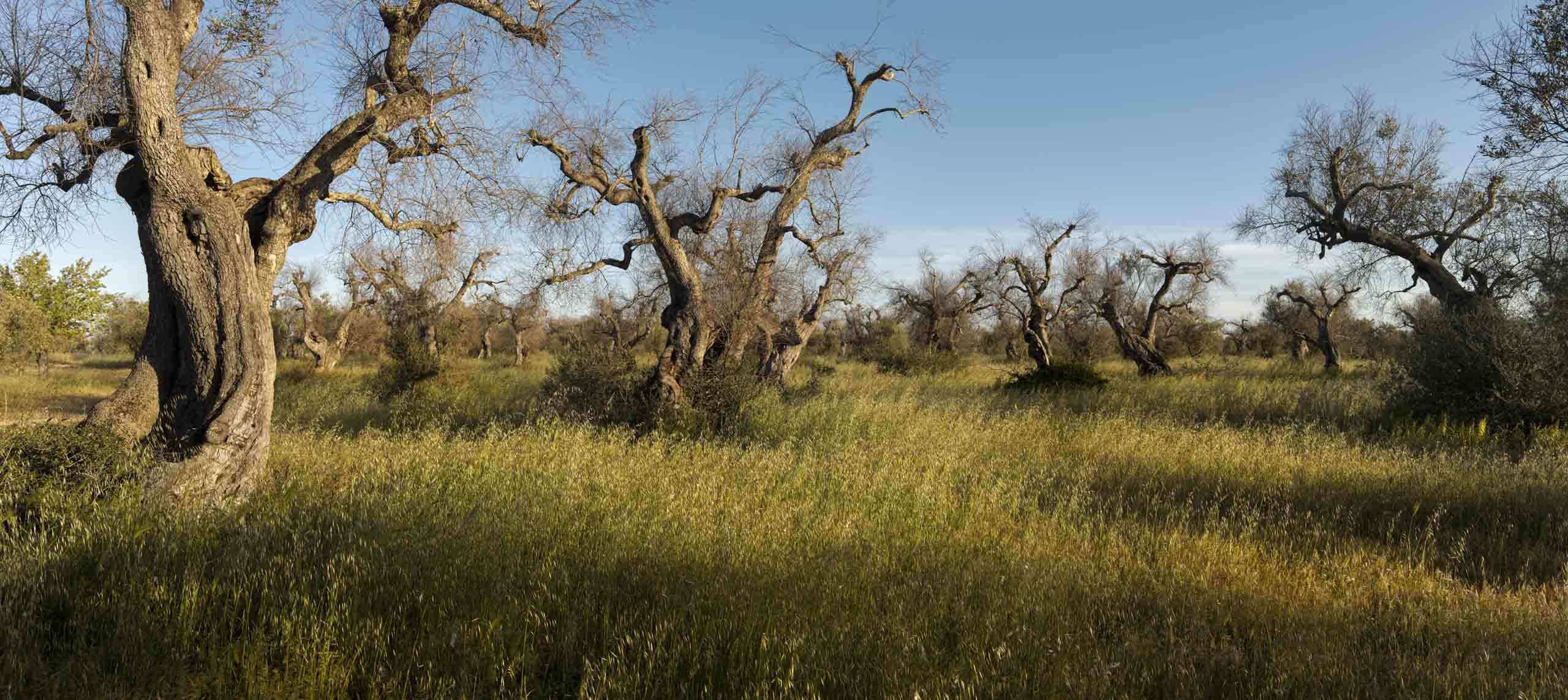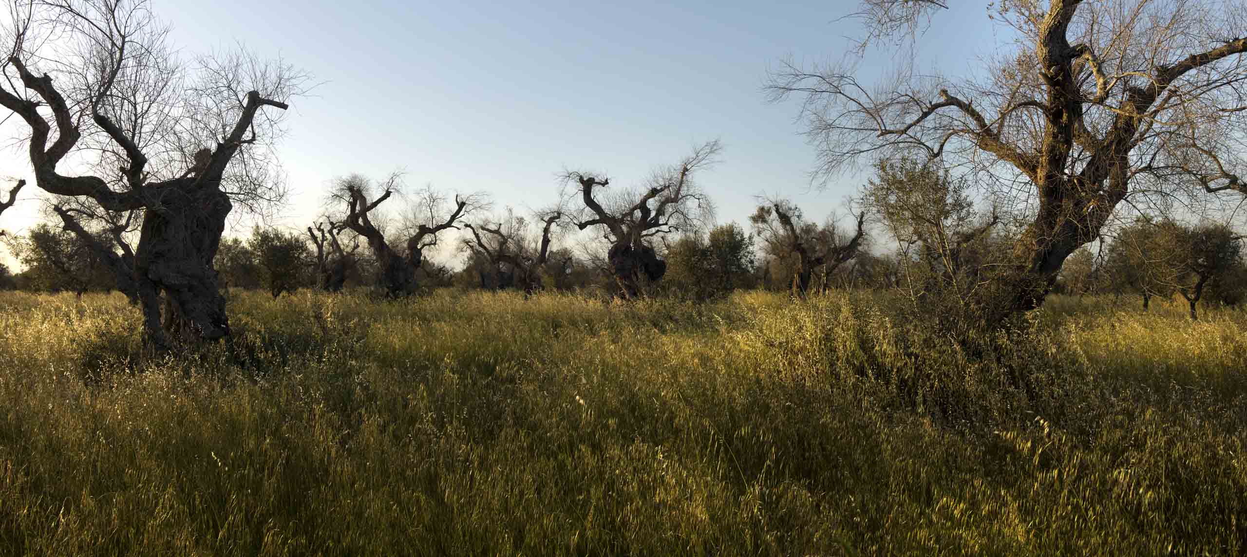 The Xylella fastidiosa bacterium, for which no remedy has yet been found, is spread from tree to tree by a tiny spittlebug that blocks the xylem, the vascular tissue that transports water from the roots to the branches, with the result that the trees dry out and die. Of the sixty million olive trees in the Apulia region, twenty million have already been infected and succumbed to desiccation.