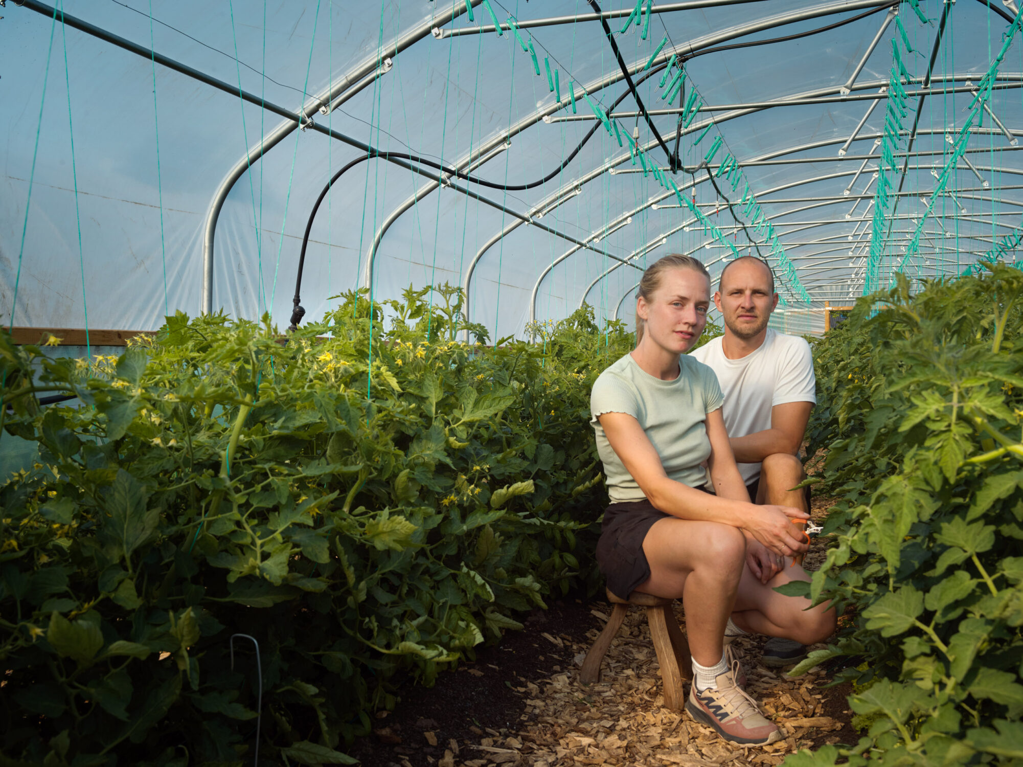 They don’t have very much time for us because there are vegetables to be harvested. Marieke got up particularly early to help harvest vegetables that are destined for the Hieros Gamos festival in Zeewolde this weekend. Jaap is busy in the farm shop, where his ingenious staging for the veg boxes is taking shape. Iris weighs and washes the vegetables.