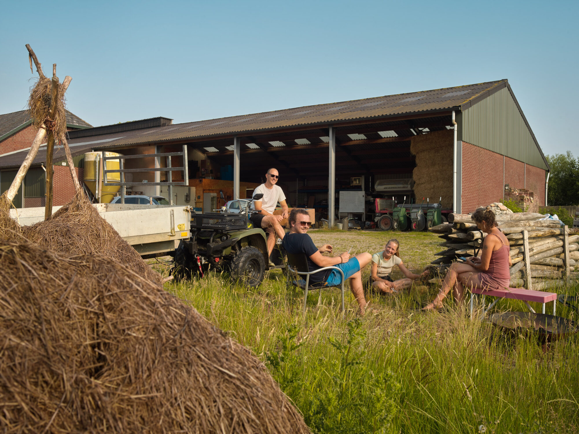 After our coffee and flan we look for a place to record Eline’s story. It’s more than thirty degrees outside and it’s impossible to find a place in the shade. In the farm shop Jaap, a friend of Yves and Iris, is drilling and building, making an ingenious system for the veg boxes. In the old cowshed we find a place for Eline to tell her story.