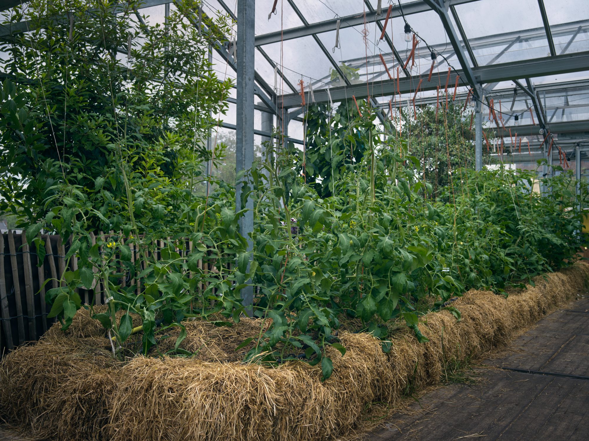 Putting a 35-centimetre layer of soil right across the roofs of the old buildings was not an option; the structure would have collapsed under the weight of the fertile earth. Bram looked for an alternative way to create a fertile substrate for his crops that the roofs would be able to bear and settled upon hay bales. In the film, Bram describes his meeting with the owner of the buildings and the search for a way of transforming the roofs into the luxuriant natural environment they have become.