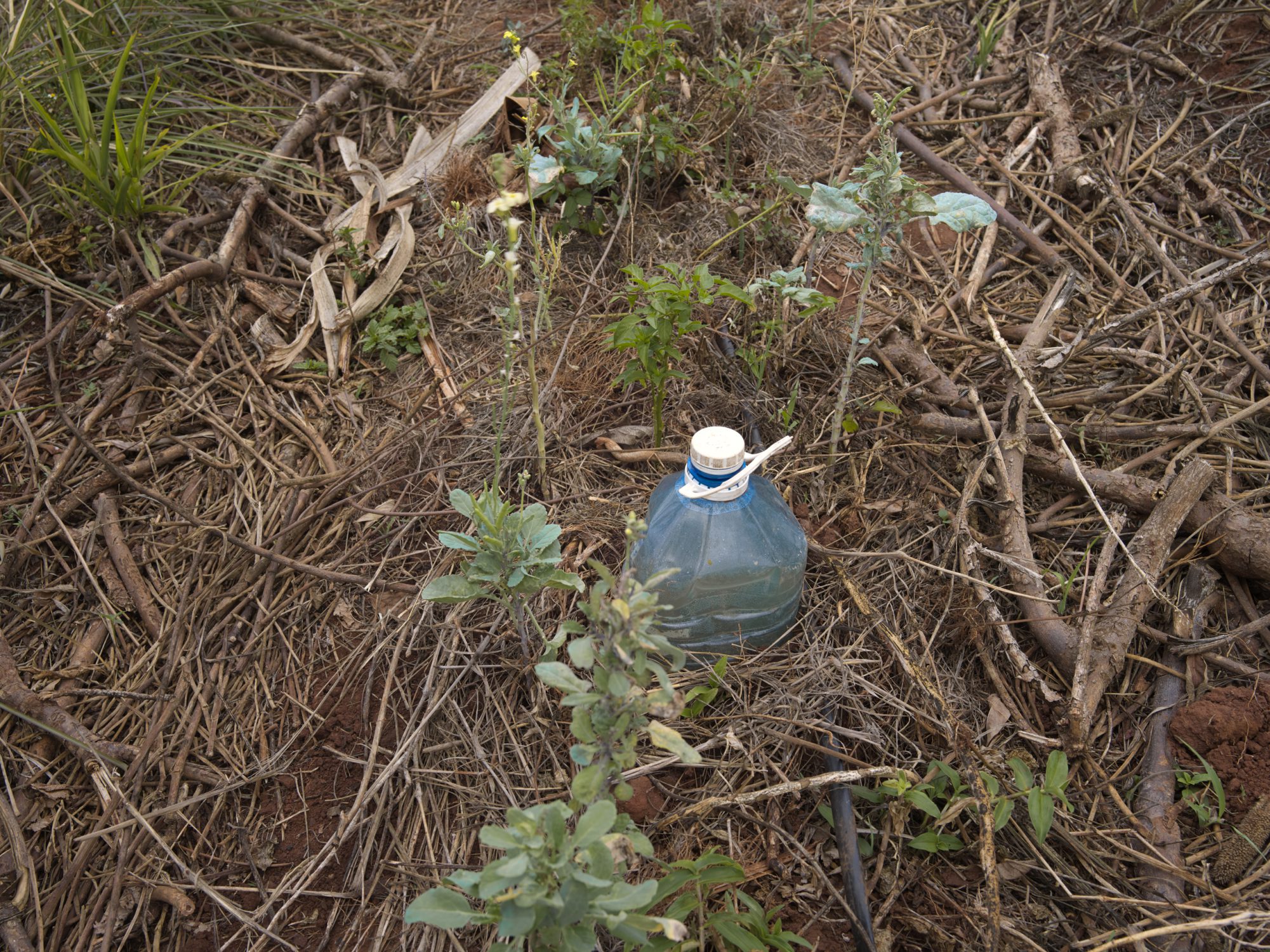 It looks almost pathetic: a little tree that needs to be kept on a drip to stay alive. But it will be big one day! With a bottle of water per month, this little tree can be raised to maturity, which is precisely what we teach the farmers when they start their own nurseries. If you intend to bring up trees to such a size, you’ll care for them as if they’re your children.