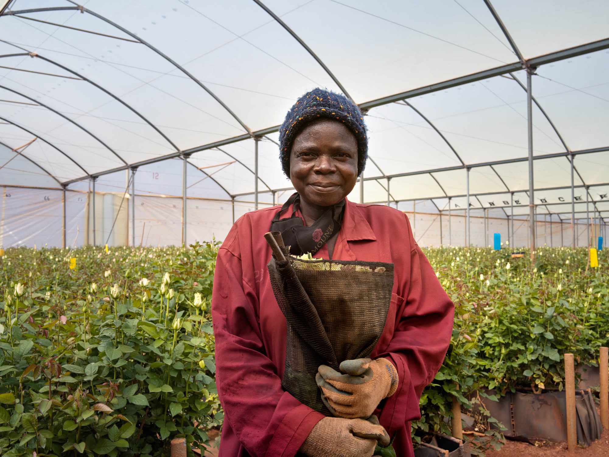 A day on the extensive Mount Elgon rose farm is a day of feasting your eyes and being part of a very big family. People are at work everywhere: in the greenhouses, in the packing hall, cutting roses and packing and transporting them. Others look after the cows and the sheep, or work in the farm’s own sawmill. The atmosphere is joyful. This is a community at work.